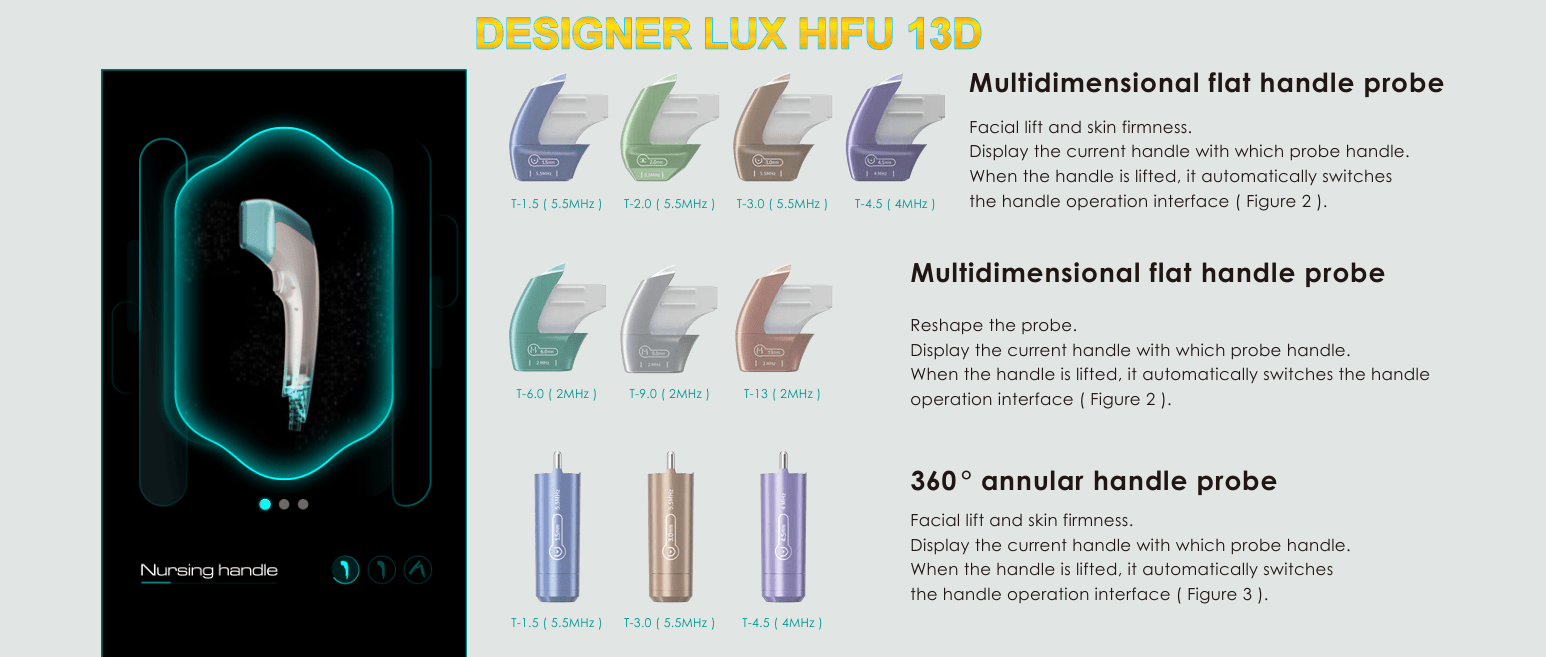 HIFU steht für High Intensity Focused Ultrasound und bietet eine hocheffektive Lösung zur Hautstraffung mithilfe von Ultraschall. Der innovative Designer Lux 13D eignet sich sowohl für Behandlungen im Gesicht als auch an unzufriedenstellenden Körperpartien. HIFU macht es möglich, tiefe Schichten der Haut und des Körpergewebes zu erreichen, ohne diese chirurgisch behandeln zu müssen. Der Designer Lux 13D kommt während der gesamten kosmetischen Behandlung nicht in Berührung mit der Haut. Es werden lediglich Impulse verabreicht, die sich gezielt auf Hautgewebe und Körperkonturen einwirken und diese von innen heraus straffen, indem die Erneuerung des Kollagens stimuliert wird. Dank mehrerer Aufsätze mit unterschiedlichen Reichweiten können verschiedene Schichten des Haut- und Körpergewebes behandelt werden.